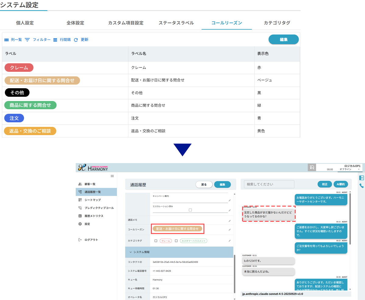 HARMONYでは、顧客が電話をかけてくる理由を複数の候補ラベルからAIが自動で選択し、最適な「コールリーズン」ラベルを付与します。これにより、管理者(SV)は通話を全て聞かなくても、ラベルを見るだけで電話発生の理由を瞬時に把握可能です。