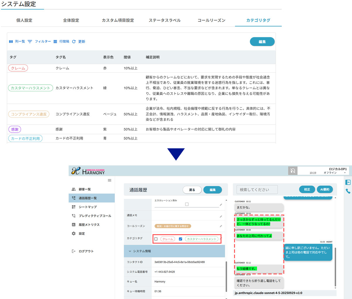 HARMONYでは、通話内容をAIが自動分析し、あらかじめ設定したカテゴリと一致する場合のみ「カテゴリタグ」を付与することが可能です。通話後に自動でタグ付けされるため、管理者(SV)は内容を迅速に整理・把握でき、タグ情報を活用した傾向分析や業務改善が容易になります。