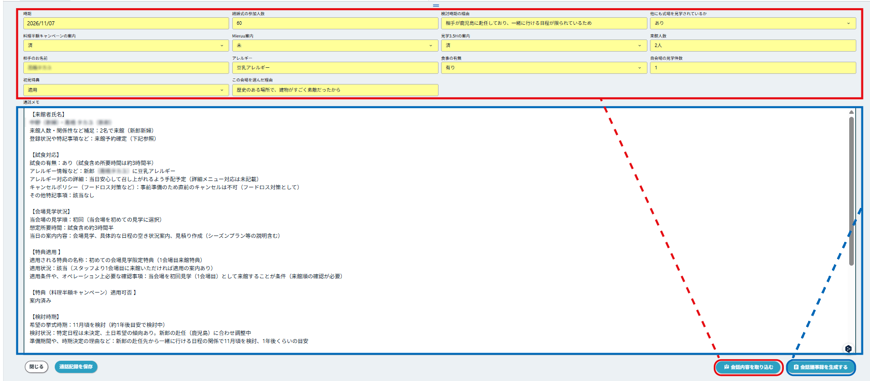 お客様との通話終了後、「会話内容を取り込む」と「会話議事録を生成する」のボタンをクリックするだけで、複雑なヒアリング内容を基幹システムの各入力項目に合わせて正確に入力してくれます。